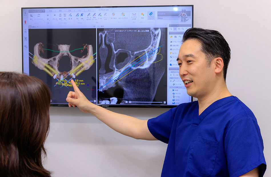 「すでにインプラントが入っていて、また埋められるか分からない」「総入れ歯を入れなくてはいけない」「移植が必要と言われた」など、治療が難しいとされる方ほどオールオン4は適しています。ただ、お悩みの内容や症状はそれぞれ異なるため、最適な方法を追求するために大切にしているのがカウンセリングです。まずは患者様のお話をじっくり聞くことに重きをおいているのです。あわせてCTや精密検査で状況を把握し、これまで手掛けたインプラント1200症例以上、オールオン800症例以上の経験を踏まえて、その方に合った治療法をご提案しています。そして、治療に欠かせないノウハウと材料、安心して過ごせる空間、信頼できるチームのサポートをバックに、院長自らが一貫してほとんどのプロセスを担います。また、残せる歯は残したい、患者様のためになる治療を選択したい、との考えから、結果的にオールオン4以外のインプラントを採用したり、インプラントを入れずに歯周病治療だけで治せたり、ときには他院をご紹介することもあります。それも全て、患者様にとってベストな方法をご提案して、健やかな人生を取り戻していただきたい、という想いに他なりません。