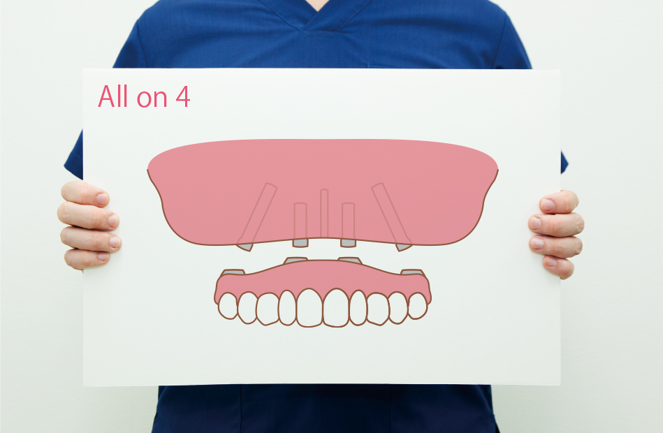 インプラントの1つであるオールオン4は、歯が全くない方に1日で噛める歯を提供する治療法です。通常、全ての歯を入れるには28本のインプラントを埋めなくてはならず、大掛かりな手術になり、場合によっては骨の移植も伴います。そのため、時間も費用もかかるうえ、治療期間中は入れ歯が必要で、食事やコミュニケーションなどの日常生活で精神的な負担を感じることもあるでしょう。そんな負担を回避できるのが、オールオン4です。片あご4本ずつのインプラントで全ての歯が入るオールオン4は、抜歯から仮歯の装着までを1日でおこなう集中治療により、その日のうちに整った歯で通常の食事ができるまでになります。長期にわたる通院も入院も要らず、インプラントの数が少ないためコストも抑えられるなど、患者様にとってのメリットが多いのです。実際に、それまで口元に自信がなかった方や噛める歯を諦めていた方からは、自然な見た目と快適な付け心地のオールオン4を入れたことで「人前で食べたり話したりできるようになった」「元気になって外出や旅行を楽しんでいる」などの嬉しい声をいただいています。