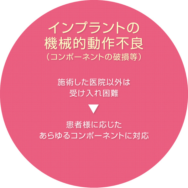 インプラント治療と歯周病は相互関係が深いのが特徴です。インプラント自体の不具合が発生する原因として、『インプラント歯周炎』と『インプラントの機械的動作不良』が挙げられます。